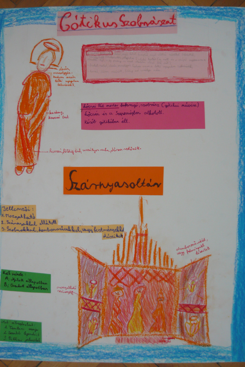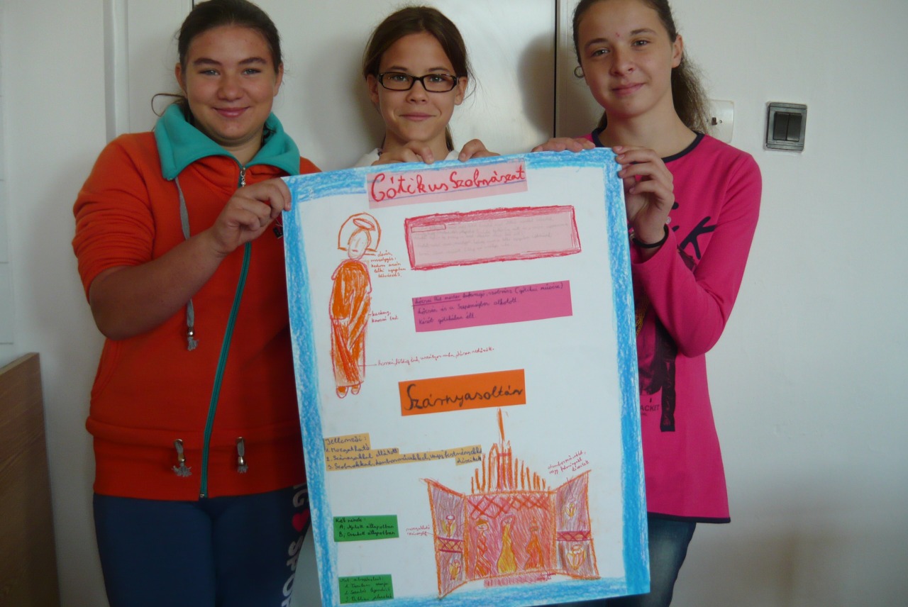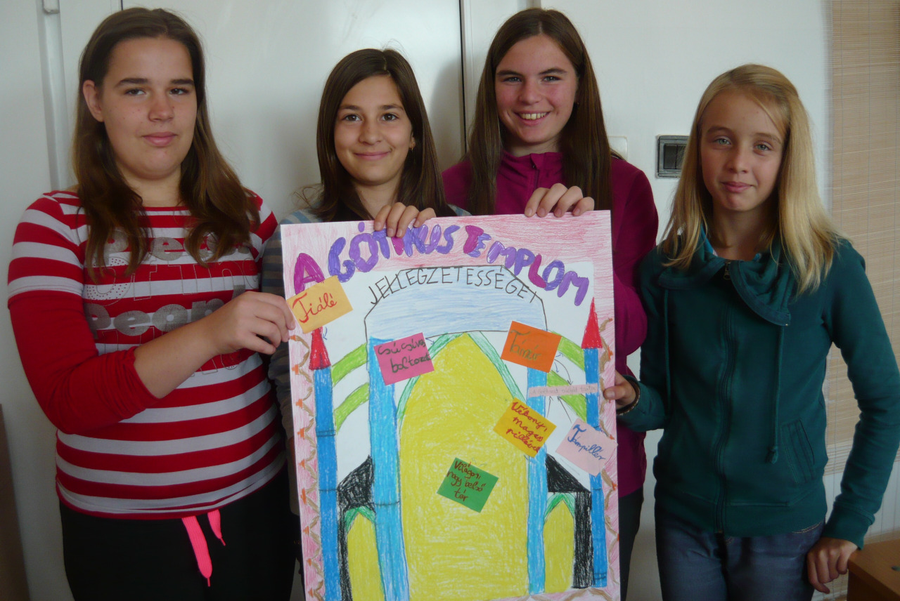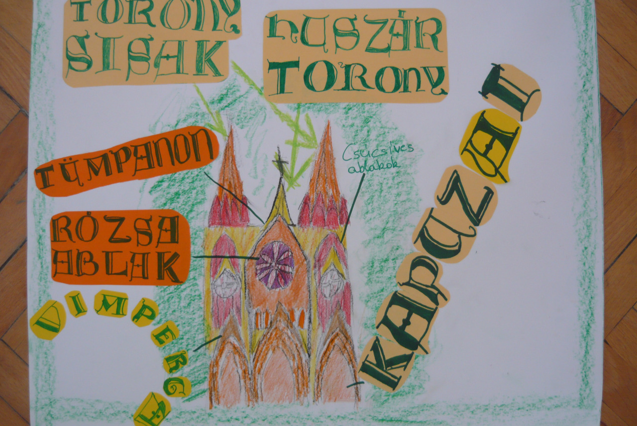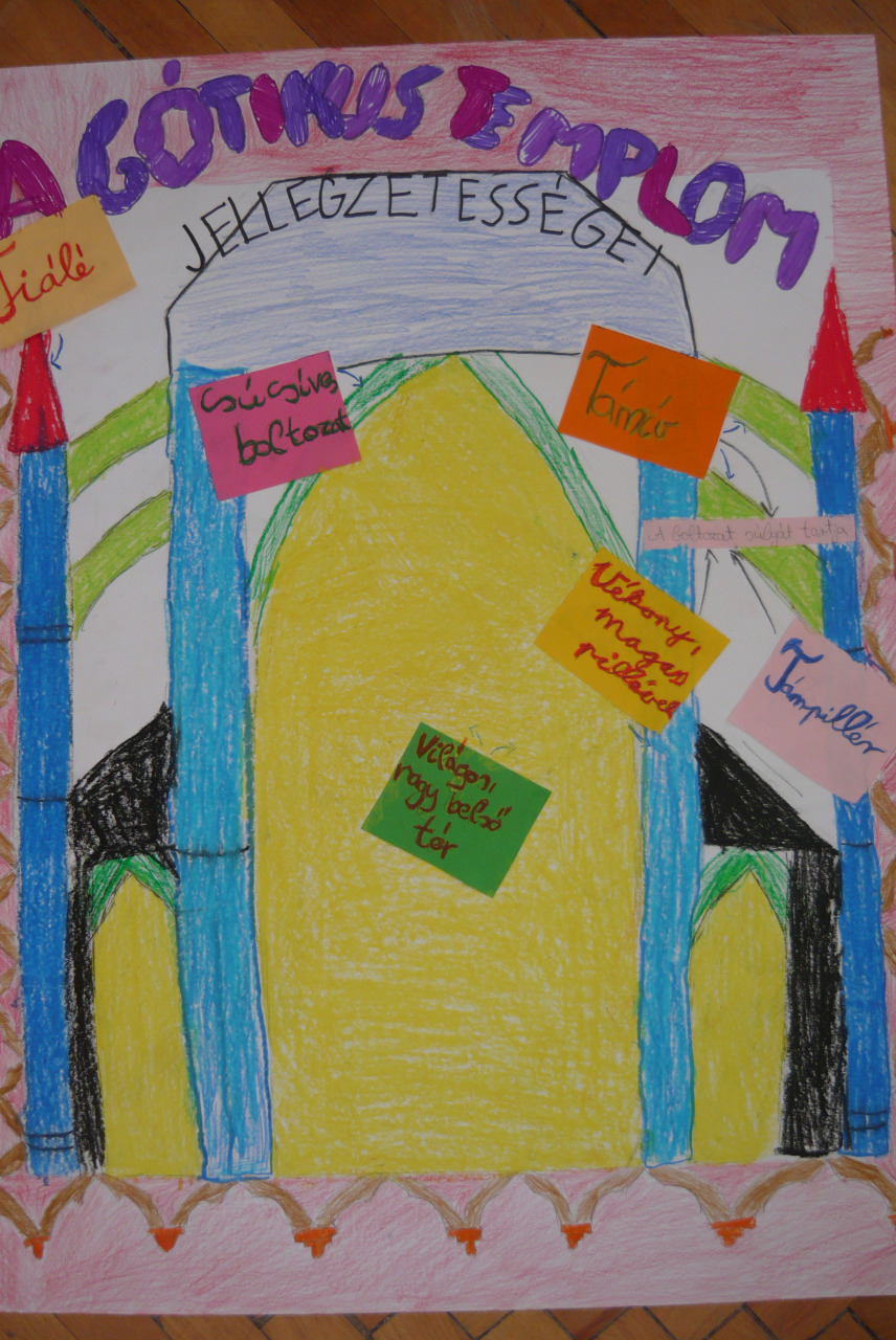 A mi feladatunk a gótikus templom jellegzetességeinek bemutatása.Sok feladatot kaptunk, amelyetfel kellett osztani négyünk között. Gótikus templom rajzolása,majd jellemzői bejelölése :támpillér, támív, fiálé, vékony magas pillérek, csúcsíves boltozat, világos nagy belső tér.